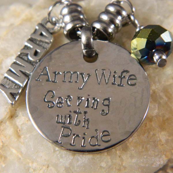 DescriptionAre you an Army Wife and Serving with Pride? Well than this is the necklace for you. This necklace is made a 7/8 inch stainless steel disc. I hand stamped, "Army wife Serving with pride" . I blackened the stamped portion, lightly sanded, hammered to texture and polished to a bright finish. To accent, there is a cute pewter Army charm and a metallic army green glass bead charm. It comes with an 18 inch, 2x1mm stainless steel curb chain. Great gift for the Army wife!!