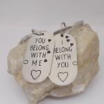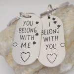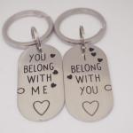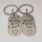 DescriptionThese keychains are made with stainless steel metal pieces with one, I Belong with You and the other with, You Belong With Me. They are attached to heavy duty stainless steel keyrings. They pair are slightly sanded for a matte finish. Each one measures 7/8 x 1.75 inch. You will get both keychains shown in photo.KC20-for seller's reference.