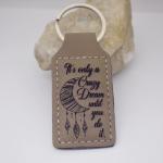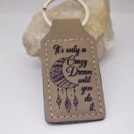 DescriptionBeautifully laser engraved brown faux leather, made for lasering with, It's only a crazy dream until you do it with cute boho moon dream catcher. It measures 3 5/5 x 1 3/8 inch. Good size for a keychain. This would make a great Graduation Gift, Birthday Gift. or anytime gift. A great motivational keychain to go after those dreams. Life is short and with the right mindset and motivation, this would be a great reminder.KC15-for seller's reference.