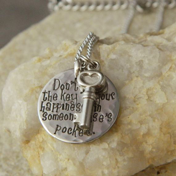 DescriptionThis necklace is made with a 1 inch stainless steel disc. I hand-tamped, DON T PUT THE KEY TO YOUR HAPPINESS IN SOMEONE ELSE S POCKET, textured and polished to a bright finish. To accent, I added a stainless steel key charm. It comes with an 2x1mm or 3x4mm stainless steel curb chain. Great inspirational piece.Stainless steel will not fade, rust or tarnish.