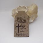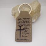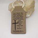 DescriptionA brown leather faux keychain with For I know the plans I have for you, declares the Lord, plans to prosper you and not to harm you, plans to give you hope and a future. A bible verse from Jeremiah 29:11. The saying is on both sides. The design is on both sides of the keyring. It measures 1.5 x 2.75 inch. What a great inspiration piece. KC33-for seller's reference.
