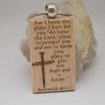 DescriptionThis wooden keychain is laser engraved with bible verse from Jeremiah 29:11. It says "For I know the plans I have for you" declares the Lord, "plans to prosper you and not to harm you, plans to give you hope and a future". Great Christian gift for Graduation, First Confirmation or Communion. Keychain measures approx. 3.25x1.25 inch. KC26-for seller's reference.