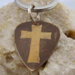 DescriptionThis necklace is made with a brass guitar pick. I etched a large cross on the brass with etching solution. I lightly sanded leaving it a matte, scratched rustic finish. It is attached to a heavy duty stainless steel keyring. Unique and fun keychain.