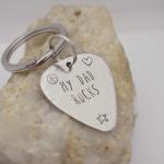 DescriptionThis one is for Dad! This is made with a stainless steel guitar pick metal piece. I hand stamped "MY DAD ROCKS", and I also stamped a peace sign, heart and star along the outer edges. It was hammered for texture, letters blacken, lightly sanded and then polished to a bright finish. It is attached a 28mm stainless steel split ring keyring. What a great Fathers Day gift or just an everyday gift that tells your Dad that he is awesome!KC28-for seller's reference.