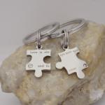DescriptionThese keychains are made with stainless steel metal puzzle pieces with the inscription, Love is always here now and forever.They are both attached to stainless steel heavy duty key rings with stainless steel split rings. You will get the pair of key chains.KC35-for seller's reference.