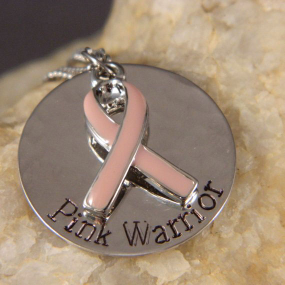 DescriptionThis necklace is made with an 1 inch round stainless steel disc. I hand-stamped PINK WARRIOR on the blank, hammered for texture, blacken the stamped portion, lightly sanded and polished to a bright finish. I attached a pink enameled ribbon. It is attached to an 2x1mm, stainless steel curb chain.