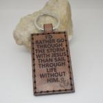DescriptionMade from plain veg tan tooling leather, I laser engraved a beautiful sailboat on one side and "I'D RATHER GO THROUGH THE STORM WITH JESUS THAN TO SAIL THROUGH LIFE WITHOUT HIM", on the other side. It was then stained with Vintage Gel, Medium brown, leather lotion applied to protect and condition the leather then a protective acrylic finish of Resolene was wiped over the leather. I added some leather cement glue and folded and hand stitched with 5 strands of cotton thread. It is attached a 28mm heavy-duty stainless-steel split ring key ring. It measures 3.75x1.5 inches. What a beautiful faithful and inspirational keychain.KC24-for seller's refernce.